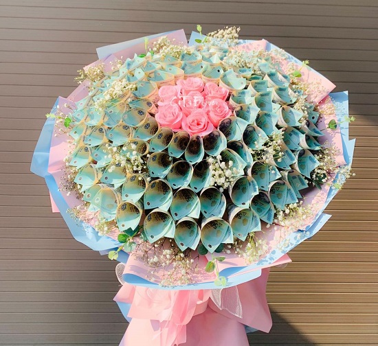 Không cần phải quá nhiều tiền để có 1 bó hoa đẹp. Chỉ với 30 tờ tiền 50k là bạn đã có thể làm 1 lẵng hoa tiền 50k đẹp xuất sắc như thế này rồi.